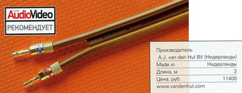 Модель D 352 Hybrid была создана ван ден Хулом для тех случаев, где важно обеспечить минимальные потери при передаче сигнала, не выходя за рамки бюджета. По технологии изготовления он практически не отличается от описанного выше Royal Jade Hybrid — такие же тонкие (0,15 мм) проводники из меди OFC с упорядоченной структурой, оболочка из линейно-структурированного углерода LSC, и все это упаковано в изоляцию из полимера Hulflex, выполняющую заодно и функцию внешней защиты. Различия же следующие: для минимизации потерь жилы, из которых свиты проводники, покрыты чистым серебром, а их число увеличено до 296. Таким образом, D 352 Hybrid имеет гораздо большее сечение (2 х 5,2 мм2) и обеспечивает вдвое меньшее сопротивление току при одинаковой длине. Для заделки выводов кабеля целесообразно применять универсальные разъемы-"бананы" Van den Hul. Именно такие и были установлены на кабель, присланный на нам на тестирование.