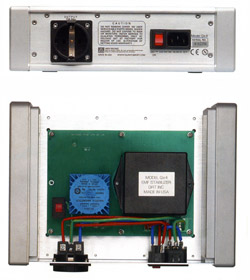 Маленький аккуратный корпус из толстостенного алюминия. Внутри — плата с неким электронным блоком, подключенным к сети параллельно. Блок скрыт под пластиковым кожухом и питается от тороидального трансформатора с двумя вторичными обмотками по 12 В (Amveco Magnetics, Индия). На задней панели имеются одна розетка с надписью "не более 10 А", разъем МЭК и выключатель с индикаторной лампой. Сетевой кабель в комплект не входит.