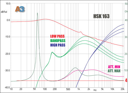 Работу аттенюатора мы иллюстрируем на том же графике, соответствующий набор АЧХ сдвинут на 20 дБ вниз. Аттенюатор твитера действует именно так, как мы привыкли ожидать. Но поскольку излучение СЧ-головки и без того ослаблено, то и работа аттенюатора проявляется слабо — мы показали характеристики в крайних его положениях.