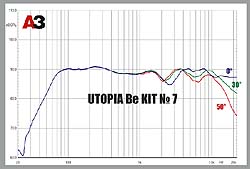 Твитер, как говорилось, дал имя всей серии. Вернее - отчество, не только потому, что «Be» стоит после имени Utopia, но и потому, что это действительно признак родства с домашней хай-эндной акустикой JMlab. Отчество возникло, как нетрудно догадаться, даже не имея учёной степени по химии, из названия материала купола. Он действительно из бериллия, уникального металла, скорость звука в котором выше, чем у всех без исключения известных человечеству материалов, от пшеничной муки до алмаза. Тончайшая диафрагма в форме обращённого купола подвешена на необычно широком (около 7 мм) плоском гофре, и всё это, вместе с массивным (для пищалки) магнитом, размещено в литом каркасе, задняя стенка которого играет и роль контролируемой акустической нагрузки, будучи расположена на расстоянии около 2 мм позади «выхлопа» в центре магнитной системы, в зазоре, разумеется - звукопоглощающий материал.