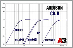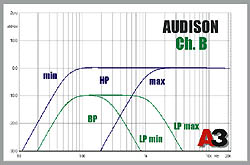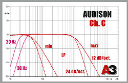 Теперь о фильтрах по порядку. В каналах A фильтр ВЧ перестраивается в пределах от 52 до 500 Гц либо от 535 Гц до 5,1 кГц, поддиапазоны чуть-чуть не перекрываются. В каналах B «нижне-среднечастотной» специализации фильтр ВЧ можно перестроить в диапазоне от 56 Гц до 1 кГц ровно, а пределы регулирования фильтра НЧ в полосовом режиме 280 — 1350 Гц. Частота среза подтонального фильтра в басовых каналах C 19 или 31 Гц при крутизне спада 24 дБ/окт. Фильтр НЧ при крутизне 12 дБ/окт. перестраивается в пределах от 52 до 1100 Гц по уровню -3 дБ, примерно те же пределы получаются и для «крутого» фильтра (24 дБ/окт.), если брать по уровню -6 дБ, как принято для фильтров 4-го порядка. В общем, если у фильтров LRx 6.9 и есть какие-либо ограничения по использованию, мы их обнаружить не сумели.
