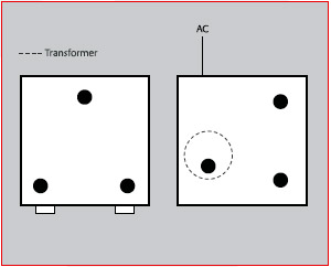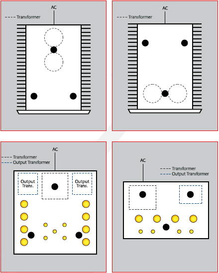 Один конус должен быть установлен под силовым трансформатором, а два других обеспечивают стабильность конструкции. В случае с ламповым усилителем также следует разместить четвёртый конус под лампами.