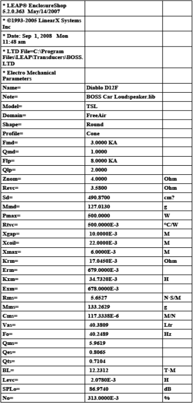А теперь T-S-параметры BOSS Audio DIABLO D12F, которые мы получили на нашем программно-измерительном комплексе, вы можете их увидеть в таблице под статьёй. Параметры, полученные нами и заявленные производителем практически идентичны за исключением измеренной реальной чувствительности DIABLO D12F. Незначительные расхождения в показателях никак не скажутся на конечном вычислении акустического оформления для громкоговорителя и укладываются в коридор допуска разбега параметров. Резонансная частота в нашем случае получилась 40 Гц, а у производителя заявлена 35 Гц. Здесь все понятно - после «разминки» подвижной системы резонанс упадет как раз на 3-5 Гц. Ну, а что касается слегка завышенного производителем показателем чувствительности громкоговорителя, здесь инженеры BOSS Audio немного схитрили и указали параметр с учетом акустических свойств салона автомобиля и при напряжении линейного сигнала в момент измерений 2,83 вольта (те самые 9 дБ). Все - в рамках приличия, и как годами принято практически во всех Американских акустических компаниях. Проверку на правдивость показаний компания BOSS прошла на пять с минусом. Теперь разберем сами параметры. Общая добротность D12F (Qts) равна 0.7, что говорит о его фриэирных наклонностях вуфера, но в то же время не исключает возможности установки в закрытый ящик (ЗЯ). Эквивалентный объем (Vas) не велик и составляет 40 литров. Да, хотим предостеречь вас на будущее! Американские компании достаточно часто указывают объемы не в кубических литрах, а в кубических футах (как это, например, указано в мануале на BOSS DIABLO D12F).