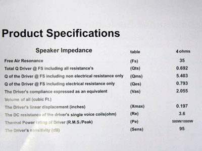 Теперь перейдем непосредственно к измерениям. В упаковочной коробке от D12F мы обнаружили мануал, в котором приведены характеристики и вариант акустического оформления от производителя. Ни для кого не секрет, что производитель частенько любит приврать в этой дисциплине, это мы сразу же и проверим. На первой фотографии отображены параметры от производителя, которые мы просто сфотографировали с мануала.