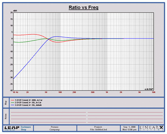Чувствительность DIABLO D12F составляет реальные 86дБ, и это очень неплохой показатель для достаточно мощного громкоговорителя с тяжелой подвижной системой и низкой резонансной частотой. С сопротивлением DIABLO D12F тоже все в порядке. Во всем диапазоне частот работы громкоговорителя сопротивление не падает ниже 3.5 Ома, что положительно скажется в работе совместно с любыми усилителями, рассчитанными на 4х Омную нагрузку. Перейдем к расчетам акустического оформления. Итак, для громкоговорителя BOSS DIABLO D12F, при нагрузке салона автомобиля объемом 2.5 куба (средне статистический седан) нам потребуется корпус закрытого типа (ЗЯ) объемом 35 литров. Ящичек получился небольшой. Учитывая малую посадочную глубину D12F, корпус с таким литражом можно без проблем спрятать в боковых нишах багажника или сделать фальшпол. Малая посадочная глубина DIABLO D12F и добротность, близкая к фриэирной, навеяли мысль о том, что этот громкоговоритель можно попробовать запихнуть и в заднюю полку седана. Какие получатся результаты, вы сможете посмотреть на графике, приведенном ниже. График АЧХ громкоговорителя BOSS DIABLO D12F смоделированный инженерно-программным комплексом LEAP. Синяя линяя – АЧХ DIABLO D12F в корпусе объемом 35 литров без нагрузки салона автомобиля (открытое пространство). Зеленя линия – АЧХ DIABLO D12F в корпусе объемом 35 литров в салоне автомобиля, объемом 2.5 куба. Красная линяя – АЧХ DIABLO D12F, установленного в заднюю полку автомобиля (Free Air), объемом салона 2.5 куба.