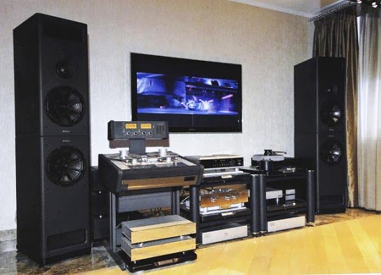 На сей раз для инсталляции стереосистемы отводилась комната гораздо больших размеров, чем в прежней квартире: 25 м2 (4,2x6 м), это совсем другое дело. Естественно, на стадии отделочных работ по отработанной технологии специалисты произвели серьезную акустическую обработку стен и пола с помощью проверенных материалов: «Изофлекс», гипсокартон и 12-мм фанерные листы. Причем пол для сведения любой вибрации к минимуму выполнен по так называемой «плавающей» технологии, а площадка под аппаратурные стойки вообще из гранита. Но и это еще не все. В ход пошли шипы, диски, антивибрационные опоры и подставки, а в полые ножки аппаратурных стоек Audio Magic Hepta 2 Level засыпали специальный песок. С потолком ничего делать не стали, т.к. этаж последний (соседи «по голове» стучать не будут!). Питание для компонентов, разумеется, подвели кратчайшим путем: напрямую от электрощитка и с гальванической развязкой нуля и фазы. И так же, как в прежней системе, все устройства подключены к сетевому кондиционеру Nordost Thor. Только на сей раз, как мы успели заметить, понадобилось два таких аппарата. Но и это оказались «цветочки», хотя и весьма необходимые для стабильной работы всей системы. Мы, конечно, ожидали, зная Юрия, увидеть что-то очень необычное, но не до такой же степени. Первое, что бросилось в глаза, солидные напольные мониторы РМС MB2S-P-XBD Neo Black. Выбор марки вполне понятен: звучание систем не только честное, но и комфортное. Для поканальной раскачки одной пары 3-полосных АС потребовалось шесть моноблоков Perreaux Prisma 750 (по три мощника на каждую колонку). Выбрать подходящий пред для обслуживания такого количества оконечников оказалось не просто, но кто ищет, тот всегда найдет. Продолжительные поиски, разумеется, с предварительным прослушиванием в итоге увенчались успехом. С учетом нужного количества балансных выходов и массой других полезных вещей выбор пал на Burmester Pre Amplifier 808 МК5. Теперь, что касается источников. Вторая стадия изумления связана именно с ними. Отменное звучание композиции «Sultans Of Swing» из альбома «Моnеу for Nothing» группы Dire Straits сначала было продемонстрировано с помощью винилового проигрывателя Scheu-Analog Premier MkII/9 и фонокорректора Nagra VPS Valve Phono Stage. Следующим был профессиональный катушечный магнитофон Studer А812, и завершил выступление представитель цифровой эпохи Burmester CD Player 069 w/power supply TopLine.