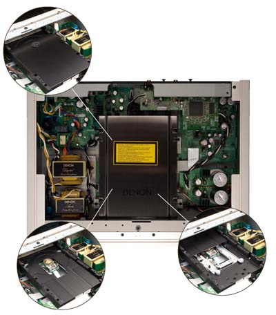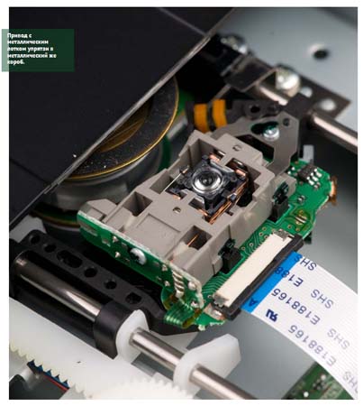 Трансформаторы в проигрывателе расположены на отдельной платформе — по всей видимости, с целью дополнительной виброразвязки. По отдельным платам разнесены и блоки питания цифровой и аналоговой частей. Привод с металлическим лотком упрятан в металлический же короб. Его проверка на качество считывания дисков с механически поврежденной поверхностью показала, что он начинает сбиваться при выпадении 2,4 мм дорожки.