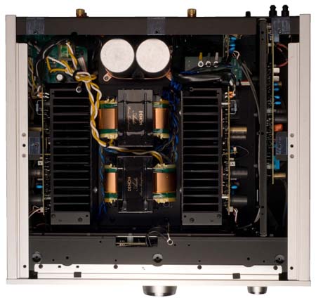 В блоке питания усилителя, помимо упомянутых выше запараллеленных трансформаторов, установлены два конденсатора номиналом по 12 тысяч мкФ, а в выходных каскадах, реализованных по двухтактной схеме в классе АВ, — по одному сильноточному полевому транзистору в каждом плече. Теперь понятно, откуда это предубеждение к элементам балансного тракта: по всей видимости, оно есть следствие желания минимизировать число активных элементов на пути сигнала. Транзисторы закреплены на радиаторах через массивные медные пластины, а радиаторы левого и правого каналов разделены физически.