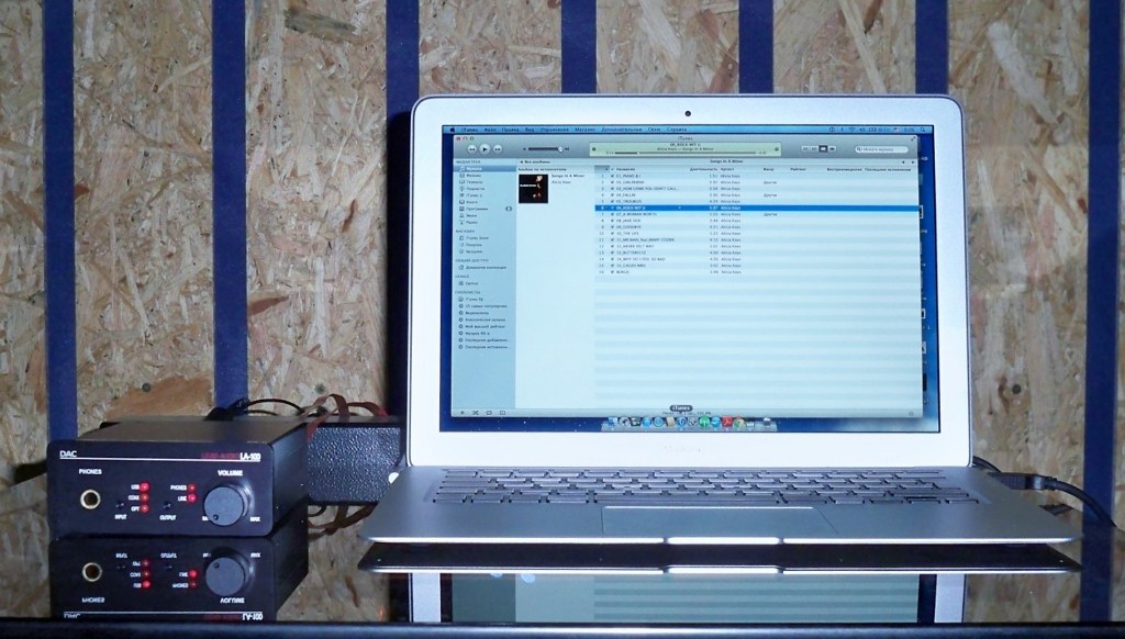 LA-100 на отлично справляется с обязанностями ЦАПа даже в соединении с бескомпромисной аудиофильской аппаратурой. Эффекта ради, мы подключили к нему довольно редкий CD плеер BurmesterCD 052 в качестве транспорта. Фигурально выражаясь, эффект в том, что эффекта нет! Разницы в звучании через внешний ЦАП и собственный на слух не ощутили как мэтры, так и не мэтры. Сцена, тембральный баланс, динамизм, четкость и чистота - идентичны. В конфигурации с компьютером (MacBook Air, Sony VPCEB ~~~) ЦАП LA-100 демонстрирует те же кондиции качественного звука. Копии дорожек аудиодисков, mp3 с битрейтом 192, 256, 320, ЦАП воспроизводит превосходно.