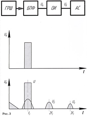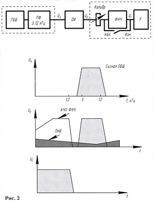 Значительно большей информативностью обладают менее известные методы измерений, использующие шумовые сигналы [1, 2, 4]. Структурная схема и спектральные диаграммы для одного из таких методов [4] приведены на рис. 2. Измерительный сигнал создается генератором белого шума (ГБШ), ограничивается полосовым фильтром (ПФ) с диапазоном частот 3—12 кГц и подается на вход объекта измерений (ОН). Продукты нелинейных искажений шумового сигнала измеряются вольтметром (V) после фильтра низких частот (ФНЧ) со взвешиванием в полосе частот 30—1200 Гц. Числовой показатель нелинейности — это выраженное в децибелах отношение среднеквадратичного напряжения продуктов искажений (Uc) к напряжению опорного сигнала (Uв), вырабатываемого встроенным в прибор генератором с частотой 1 кГц: Киш = 20 lg (Uc/Uв).