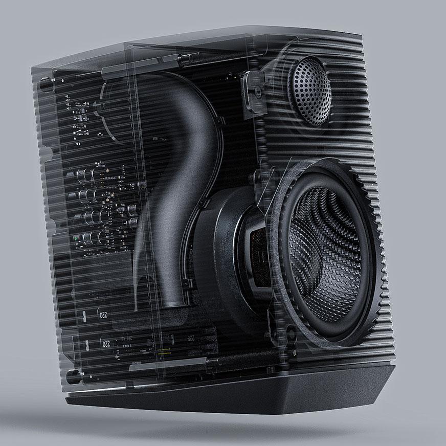 Акустика имеет двухполосную конфигурацию. Низкие частоты воспроизводит 3,5-дюймовый динамик с карбоновым диффузором. В излучателе используется несколько фирменных технических решений, позволивших дополнительно повысить его эффективность и снизить искажения звука. Нагрузкой басовика служит фазоинвертор, S-образная труба которого проходит через весь корпус по вертикали. Выходной порт расположен на задней панели. 1-дюймовый твитер с шелковым куполом оснащен облегченной звуковой катушкой из покрытой медью алюминиевой проволоки.