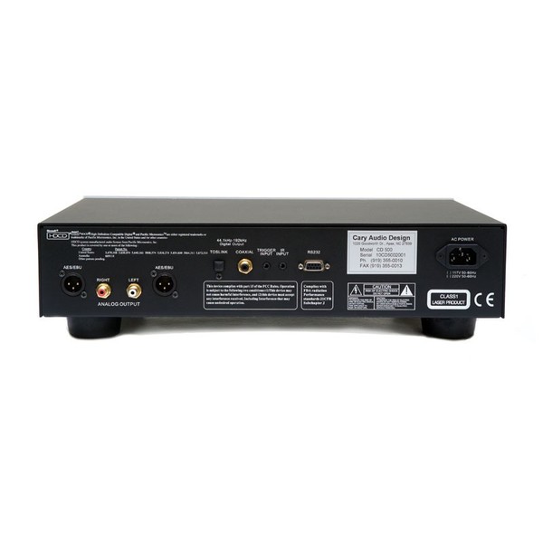Проигрыватель Cary Audio CD-500 является топовой моделью в каталоге фирмы, и обладает всеми качествами, присущими CD-плееру класса High End. Аппарат имеет функцию HDCD-декодирования, и оснащен высококлассным ЦАП Burr Brown с параметрами 24 бита / 192 кГц. Имеется функция передискретизации цифрового потока стандартного CD-Audio до 96, 192, 384, 512 или 768 кГц для обеспечения наивысшей точности обработки сигнала и получения оптимального качества звучания. В плеере приняты весьма серьезные меры для борьбы с джиттером, и перед ЦАП установлены два буфера типа FIFO, упорядочивающие входящий цифровой поток. Для считывания дисков используется многоскоростной CD/DVD-Rom с трехлучевым лазером, который совместим с CD-дисками всех типов. В блоке питания плеера установлен фирменный сетевой трансформатор, а во всех аудиоцепях используются высококлассные конденсаторы фирмы Elna.