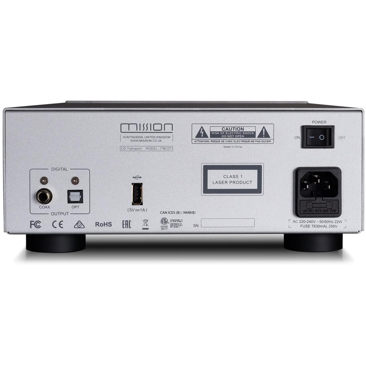 Помимо воспроизведения стандартных аудиодисков, Mission 778CDT поддерживает проигрывание файлов WAV, MP3, WMA, AAC, FLAC и APE с USB-накопителей, отформатированных в FAT16, FAT32 или exFAT. Для подключения к внешнему цифро-аналоговому преобразователю предусмотрены коаксиальный и оптический выходы с уровнем сигнала 500 +/-50 mVpp и выходным импедансом 75 Ом. Транспорт рассчитан на работу от сети переменного тока 100-120 В или 220-240 В и отличается низким энергопотреблением в режиме ожидания.