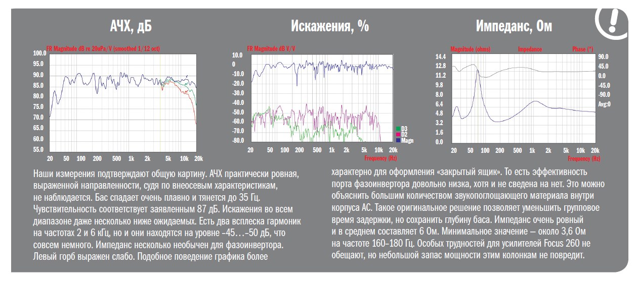 Динамики для этой модели были полностью переработаны. Алюминиевые корзины мидбасовых головок выполнены из более тонкого и жесткого профиля для снижения резонансов, а намотанные алюминием на каптоновом каркасе звуковые катушки и более мощный магнит способствуют увеличению подводимой мощности. Мягкие купольные твитеры получили новую пропитку и фланец со специальным профилем, что позволило уменьшить резонансы и сделать АЧХ еще более ровной. На задней панели кабинета расположены круглый порт фазоинвертора и одна пара клемм WBT. В комплекте, кроме шипов, имеется поролоновая заглушка для трубы фазоинвертора, видимо, на случай установки АС в углах комнаты. Декоративная решетка крепится на пластиковых клипсах. Корпус Focus 260 изготовлен из MDF толщиной 20 мм и усилен ребрами жесткости. Для поглощения вибраций служат наклеенные на боковые стенки ви-брогасящие листы, а за борьбу со стоячими волнами отвечают толстые пластины из акустического поролона и плотное наполнение из специального синтепона. Кроссоверы Dynaudio, как правило, представляют собой фильтры первого порядка с применением дополнительных фазокорректирующих цепей. В случае с Focus 260 тоже говорится об использовании фильтра первого порядка с крутизной спада 6 дБ на октаву. Однако это не совсем так. Вуферы, как и положено, подключены через катушку индуктивности, но параллельно им установлена RC-цепь, что делает спад АЧХ ломаным, с крутизной сначала значительно менее, а затем более 6 дБ на октаву. Твитер же питается от классического фильтра второго порядка с крутизной спада 12 дБ на октаву. Импеданс акустики серьезно компенсирован, поэтому сложность кроссовера осталась прежней, никакой экономии на количестве и качестве деталей не наблюдается. Посмотрим, как эти изменения отразятся на звуке.