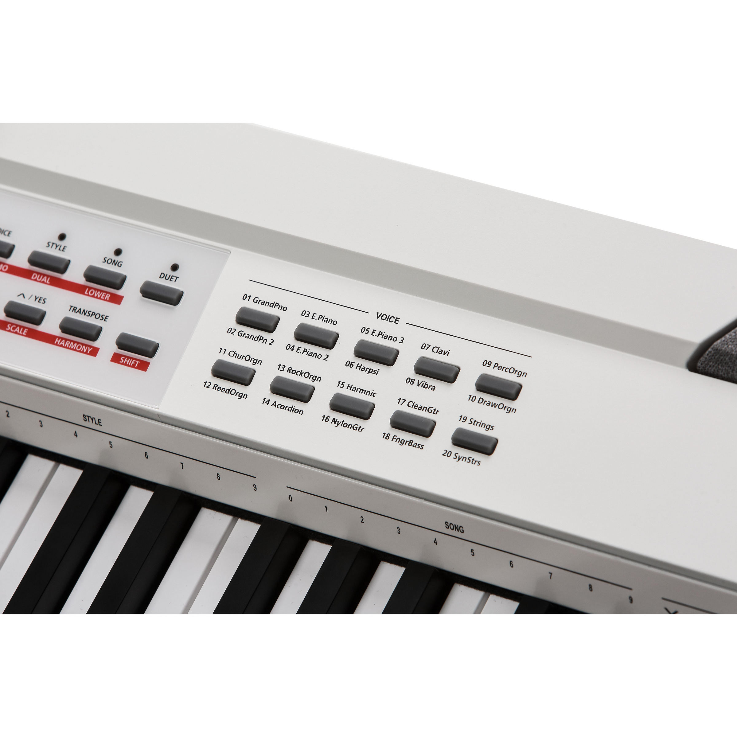 Инструмент оснащен 128-голосной полифонией. Он предлагает 20 тембров с возможностью наложения, среди которых есть несколько пианино и электропиано, клавесин, вибрафон, органы, гитары, бас и струнные. Создать объемное и красивое звучание можно с помощью встроенных эффектов реверберации и модуляции, а для частотной коррекции имеется эквалайзер. Продуктивным и интересным занятиям способствует функция автоаккомпанемента с 50 стилями, а также 60 предустановленных композиций. Функционал также включает в себя метроном с диапазоном темпа 30 – 280 ударов в минуту, транспортирование, изменение высоты тона, разделение клавиатуры и запись собственного исполнения с помощью 1-трекового рекордера.