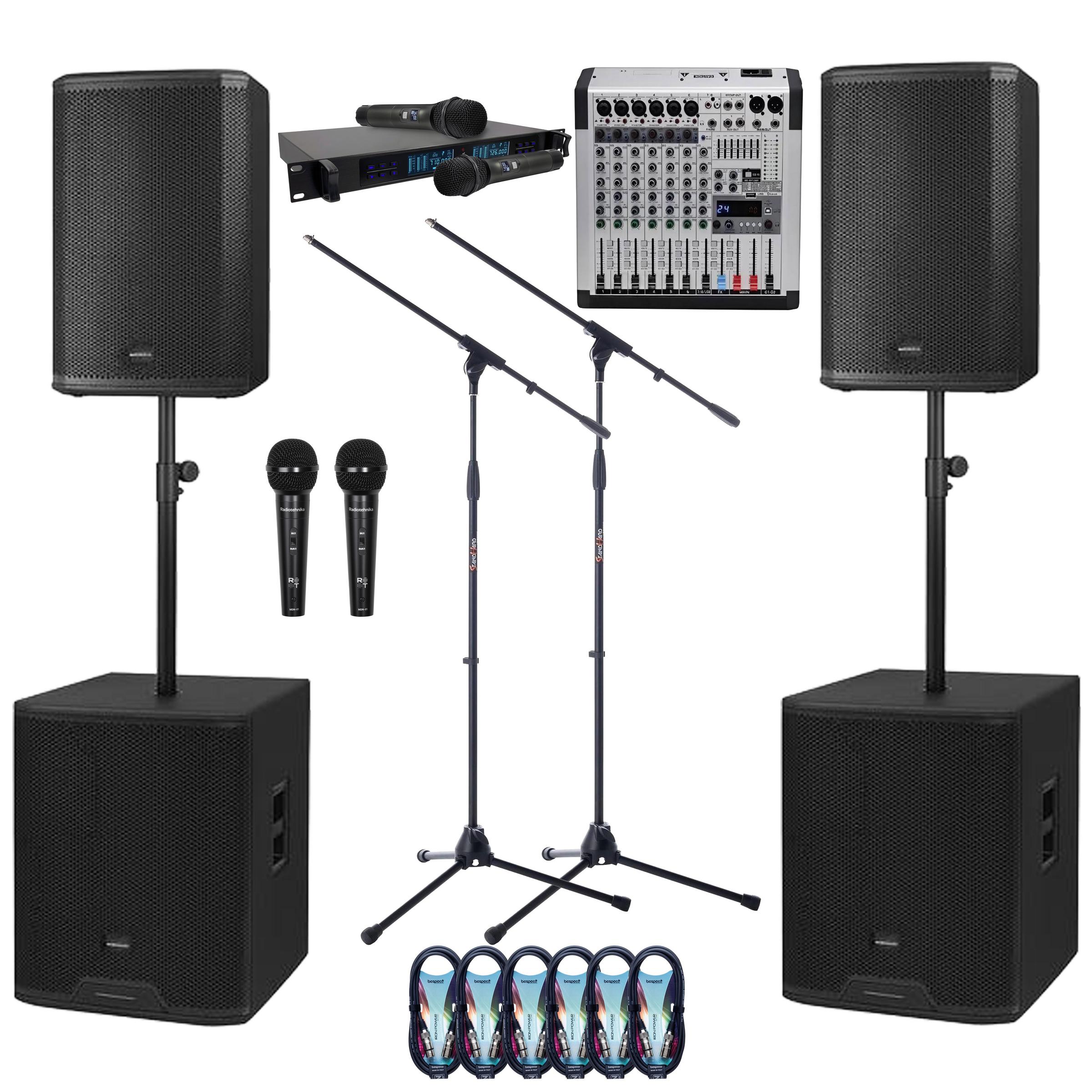 Центром управления системой является аналоговый микшерный пульт VOXNITE RM-10USB, обеспечивающий гибкую настройку каналов, подключение различных источников звука и удобную работу в реальном времени. Для выступлений предусмотрен комплект радиосистемы Axelvox DWS7000HT (RT bundle) — надежное решение с уверенным приемом сигнала. Дополняют систему два вокальных микрофона Radiotehnika MDN-01 со штатными кабелями XLR длиной по 4 метра.