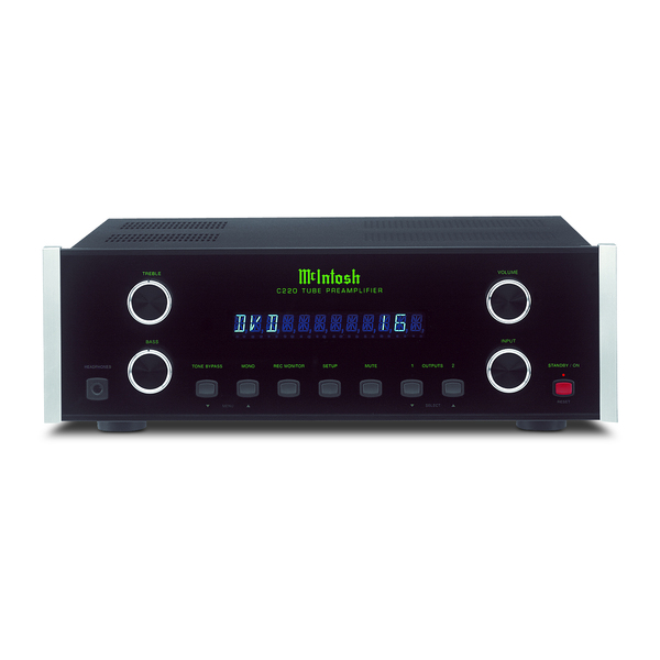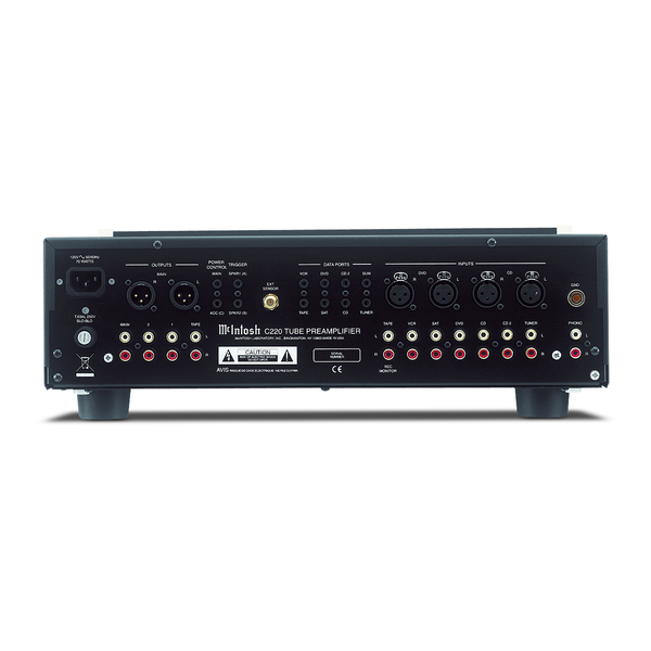 Ламповый предварительный усилитель McIntosh C220 оснащен очень полезной функцией индивидуальной электронной настройки чувствительности каждого входа, которую можно осуществить как с передней панели, так и с пульта дистанционного управления. Аппарат имеет фонокорректор для MM-звукоснимателя, построенных на двойных триодах 12AX7, и не уступающего автономным устройствам. Схема линейного усиления звука построена на двух таких же лампах. Также McIntosh C220 имеет очень качественный встроенный усилитель для наушников, рассчитанный на работу с моделями с импедансом от 16 до 250 Ом.