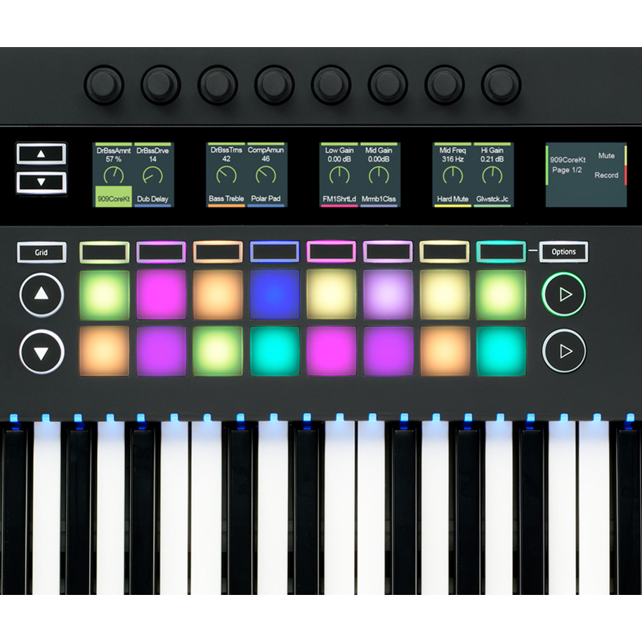 Для исполнения мелодических партий устройство оснащено полувзвешенной клавиатурой синтезаторного типа с 49 клавишами, чувствительными к силе нажатия, оборудованными технологией послекасания (Aftertouch). Такой тип клавиш позволяет максимально реалистично исполнять не только партии для синтезаторов, но и сложные по динамике фортепианные композиции. Позволяется разделять клавиатуру на зоны, а также играть строго в пределах заданной тональности. Для ритм-партий есть 16 динамических пэдов с RGB-подсветкой, также чувствительных к силе удара. Есть 8 фейдеров, 8 поворотных регуляторов и 16 кнопок, назначаемых на любые параметры рабочей станции или виртуального инструмента. Для наглядного отображения выбранных функций есть пять ЖК-дисплеев, а для навигации по DAW присутствуют множество клавиш, отвечающих за включение и остановку записи, перемотку и другие параметры. Наконец, в наличии есть два полноценных колеса с регулируемой подсветкой, с помощью которых можно изменять высоту тона и интенсивность модуляции. Пэды могут работать в режиме 16-шагового секвенсера с диапазоном темпа от 40 до 240 ударов в минуту, функциями свинга и автоматической квантизации. Также присутствует арпеджиатор с различными ритмами, которые можно менять в режиме реального времени.