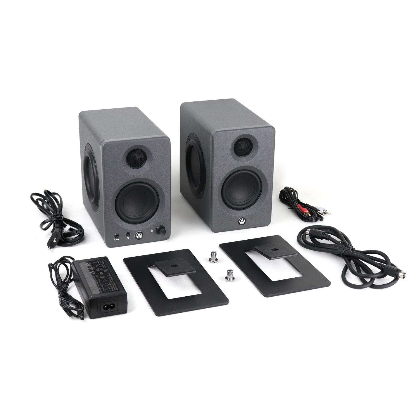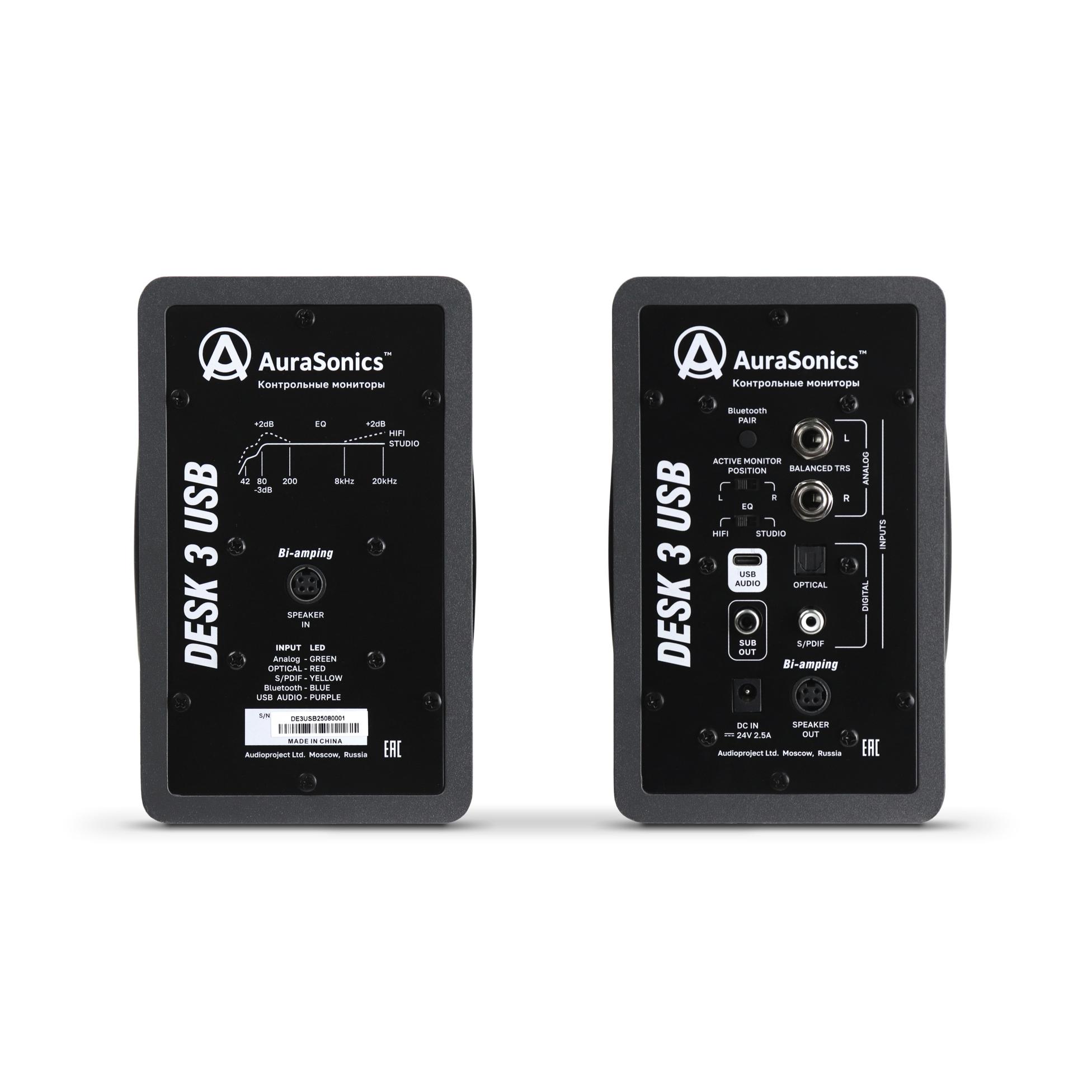 AuraSonics DESK 3 USB - универсальное настольное решение для мультимедийных задач и работы со звуком в ближнем поле. Мониторы выполнены в формате активной стереопары: усилитель и блок управления размещены в одном корпусе, что упрощает подключение и эксплуатацию. Компактные размеры и комплектные стойки позволяют удобно разместить систему на рабочем столе под оптимальным углом. Дополнительная компактность конструкции достигается за счёт применения пассивных резонаторов.