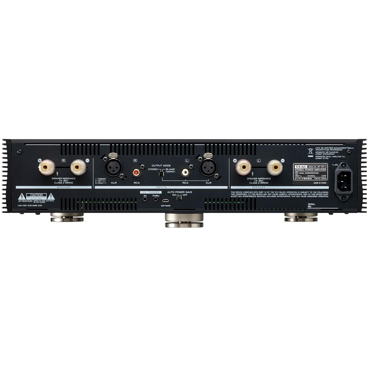 Для того, чтобы получить максимально натуральное и комфортное звучание от усилителей, работающих в классе D, TEAC AP-701 проходит специальную настройку инженерами компании. Для подключения к источнику сигнала, которым могут быть как предусилитель, так и, например, ЦАП или сетевой плеер с регулируемыми выходами, в усилителе предусмотрены балансные и небалансные входы. Акустические выходы представлены надежными винтовыми клеммами, рассчитанными на любой вариант соединения («банан», «лопатка», очищенный конец кабеля). В модели TEAC AP-701 имеется функция автоматического включения при появлении сигнала на входе, а также 12-вольтовы управляющий триггер.
