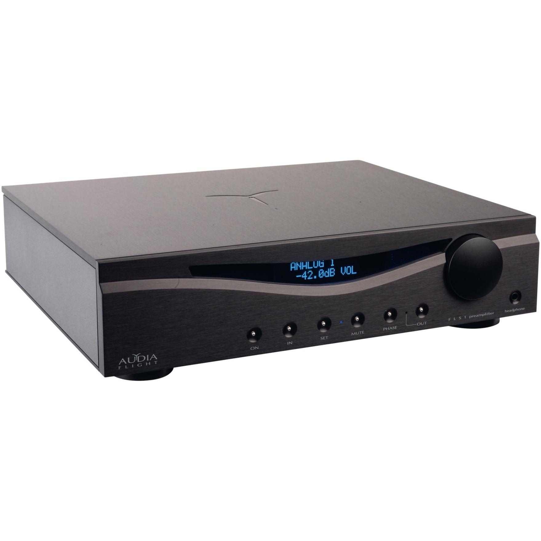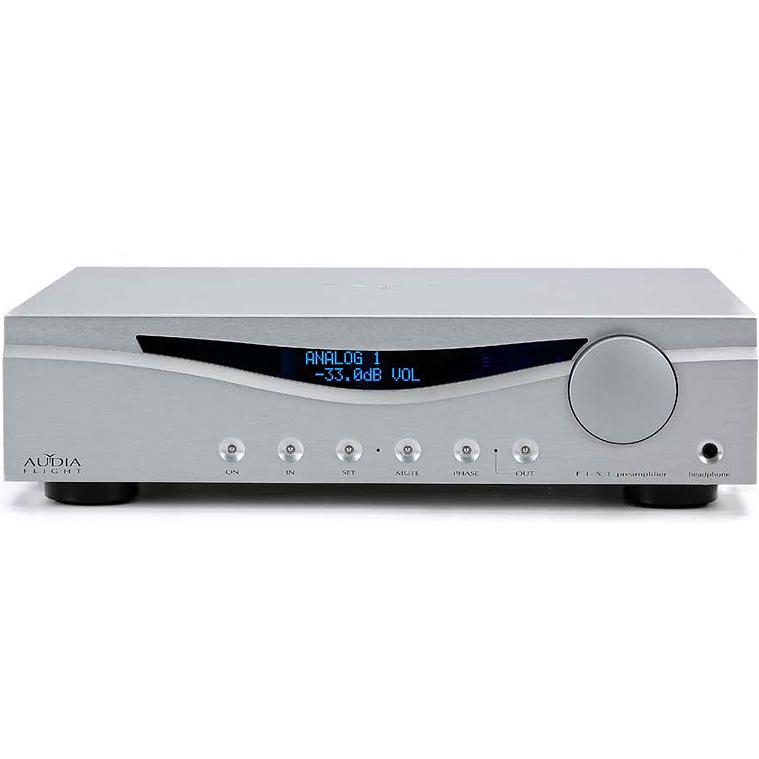 Предварительный усилитель Audia Flight FLS1, полностью балансный стерео предусилитель с встроенным усилителем для наушников, три RCA-входа, два XLR-входа, балансный и небалансный выходы, REC-выход, мощность на наушники 12 Вт при 8 Ом, диапазон частот 0,3 Гц — 500 кГц, управляющий OLED-дисплей, конфигурация «двойное моно», три тороидальных трансформатора, габариты 450 х 120 х 380 мм, вес 11,0 кг.