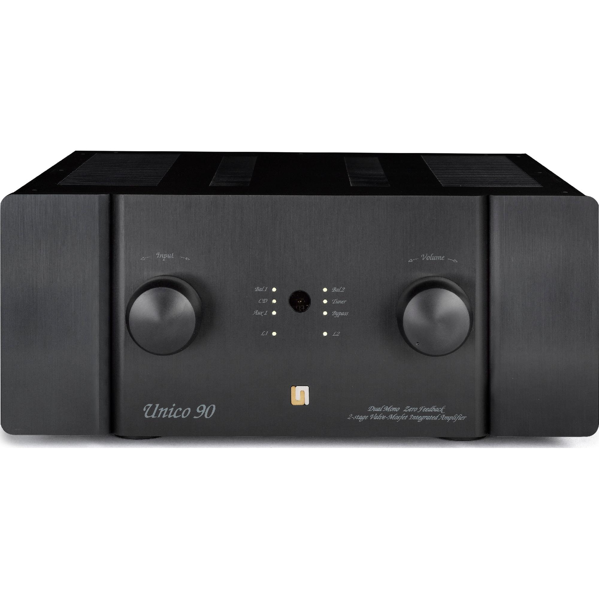 Unico 90 оснащен тремя небалансными входами RCA, двумя балансными входами XLR и одним входом Bypass для интеграции в многоканальные системы. Предусмотрены линейный выход и выход на сабвуфер с регулировкой уровня громкости. Усилитель способен уверенно работать с акустическими системами сложной нагрузки, за исключением моделей с импедансом ниже 2 Ом, что соответствует его сбалансированной архитектуре и инженерной философии.