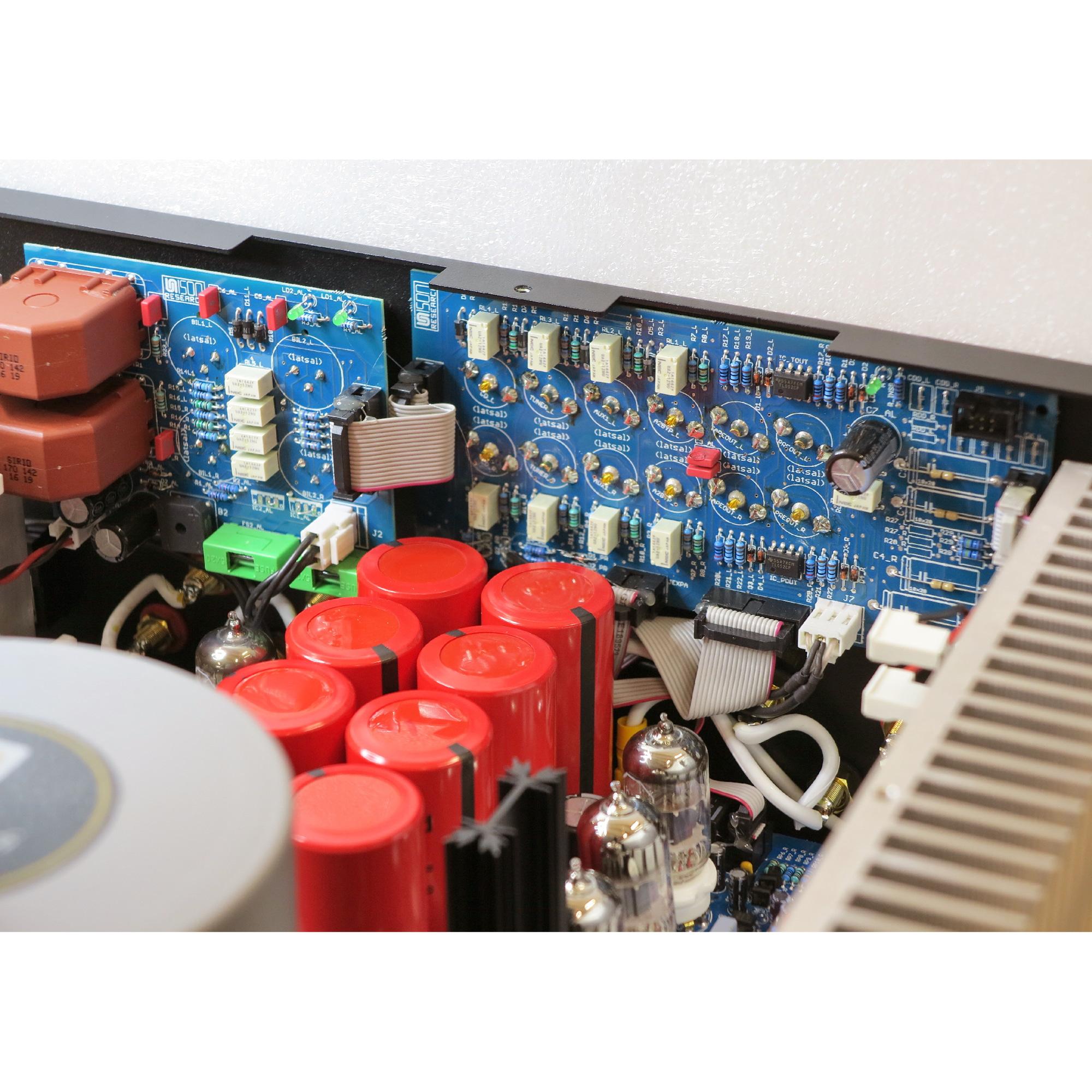 Предусилительная часть усилителя полностью пассивная. Регулировка громкости реализована с помощью потенциометра ALPS, выполненного по многосекционной схеме для повышения точности баланса каналов и снижения уровня шумов. Коммутация входов осуществляется механическими реле, размещенными непосредственно за разъемами, что минимизирует длину сигнального тракта и снижает вероятность наводок.