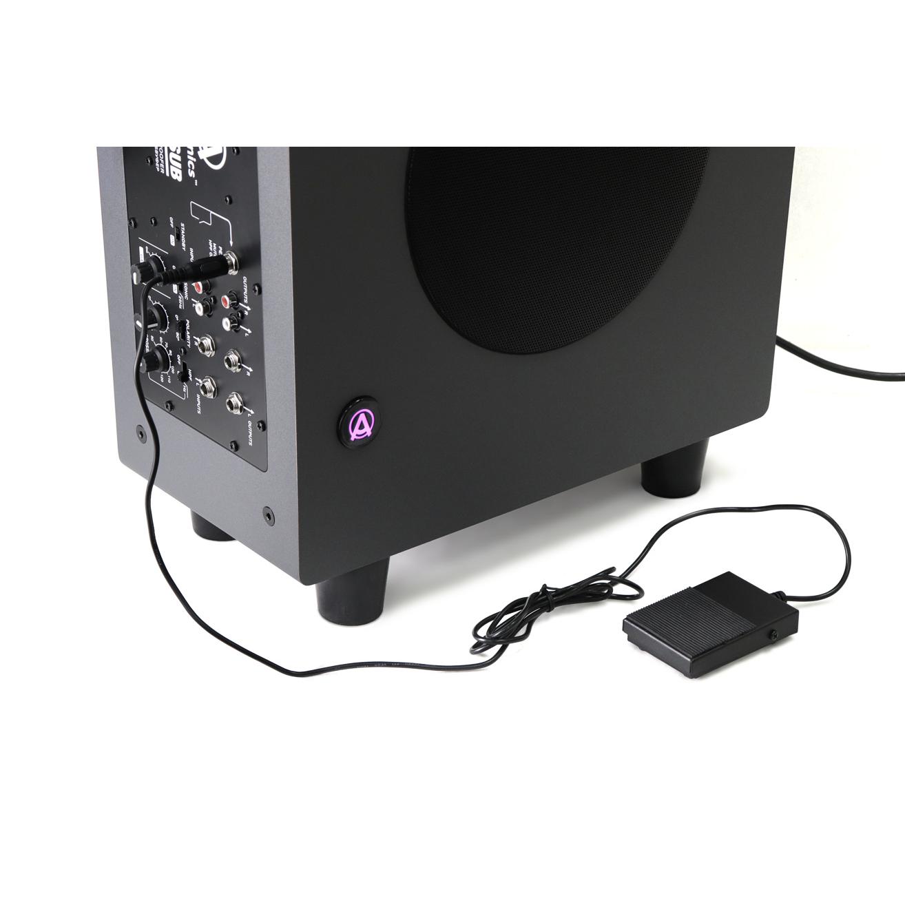 В комплект входит переключающая ножная педаль, подключаемая к разъёму TS-Jack PEDAL. Педаль позволяет оперативно включать и отключать сабвуфер во время работы. При отключении сабвуфера одновременно отключается встроенный фильтр HPF, что даёт возможность мгновенно сравнить звучание акустических систем с сабвуфером и без него. Когда сабвуфер выключен педалью, логотип-индикатор на передней панели загорается красным цветом.