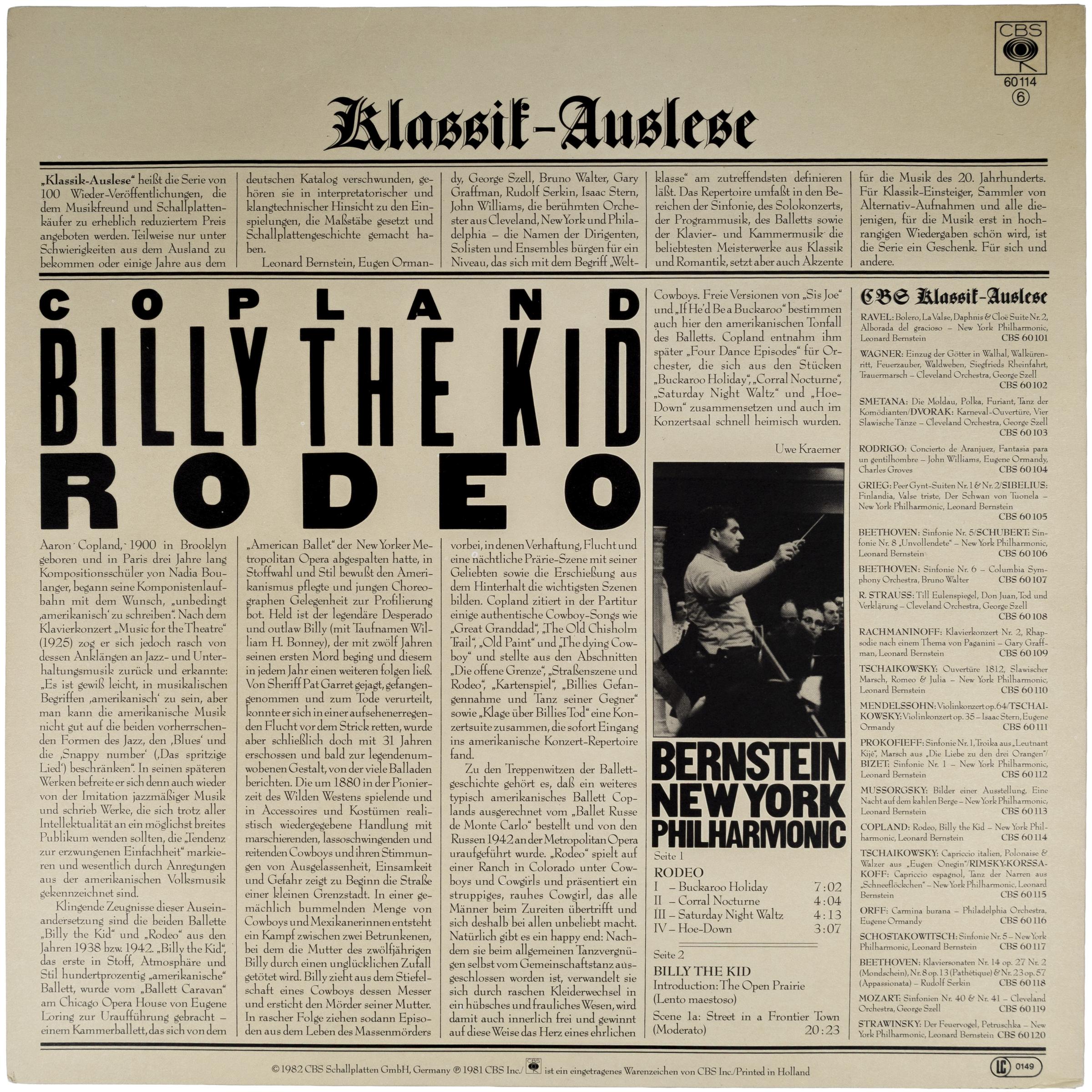 Представляем вам издание "Billy The Kid / Rodeo" от легендарного композитора Аарона Копленда, исполненное под управлением маэстро Леонарда Бернстайна и блистательным Нью-Йоркским филармоническим оркестром. Эта пластинка, выпущенная в 1982 году на лейбле CBS в рамках престижной серии "CBS Klassik-Auslese" в Голландии, является настоящим сокровищем для ценителей классики и винтажного звука.