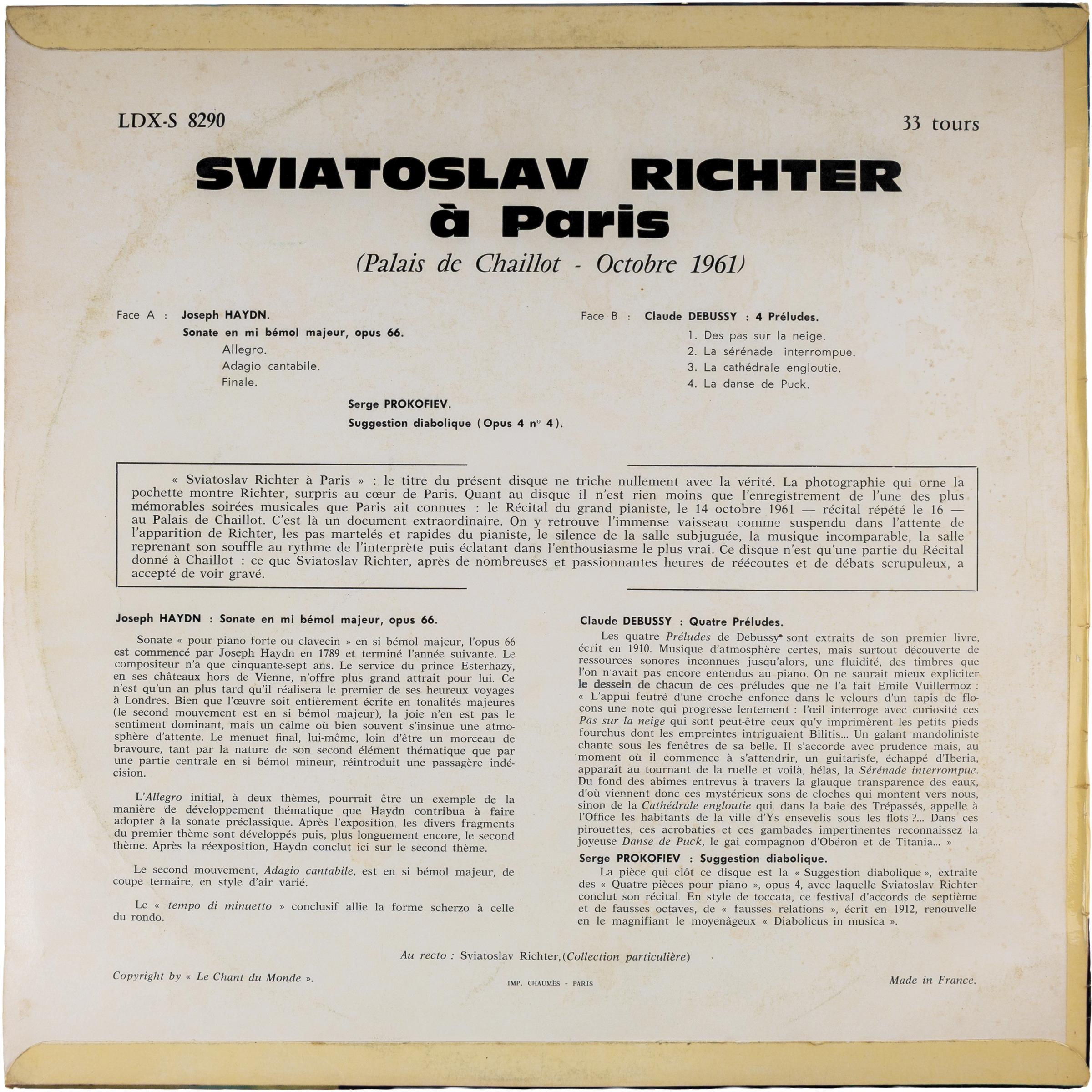 Описание винтажной виниловой пластинки HAYDN, DEBUSSY, PROKOFIEV "SVIATOSLAV RICHTER A PARIS"